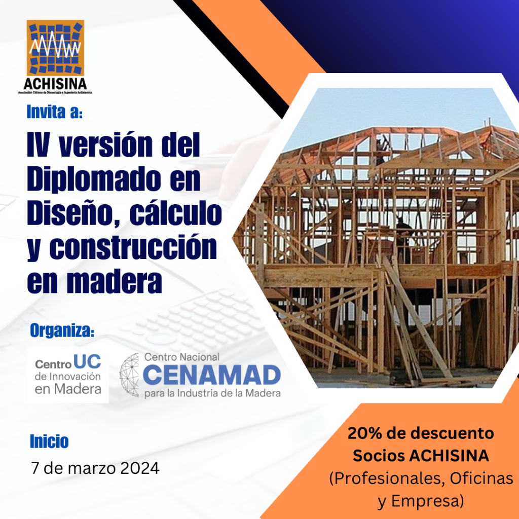El 7 de marzo 2024 inicia la IV versión del Diplomado en diseño, cálculo y construcción en madera, organizado con el Centro de Innovación en Madera de la UC y CENAMAD. Los socios ACHISINA tienen un descuento del 20%.