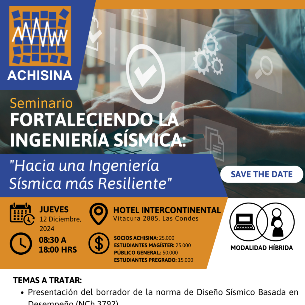 El 12 de diciembre 2024 se realizará el seminrio Fortaleciendo la Ingeniería Sísmica. Hacia una Ingeniería Sísmica más Resiliente, organizado por el Directorio de ACHISINA. El Seminario será híbrido y se llevará a cabo en el InterContinental.