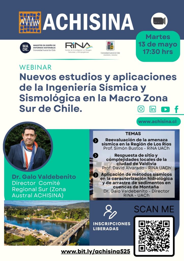 El 13 de mayo 2025 se realizará el seminario Nuevos estudios y aplicaciones de la Ingeniería Sísmica y Sismológica en la Macro Zona Sur de Chile, organizado por ACHISINA. El Seminario será online y las inscripciones son liberadas.